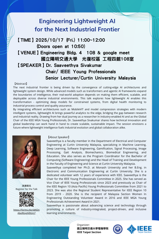 人工智慧的未來,正在邁向「輕量化」的新世代!本次由 Dr. Saaveethya Sivakumar 主講的專題演講 「Engineering Lightweight AI for the Next Industrial Frontier」,將帶領大家深入了解如何在數位健康監測、智慧製造與品質控管等領域中,運用輕量化 AI 架構實現高效能與可擴充的智慧應用。