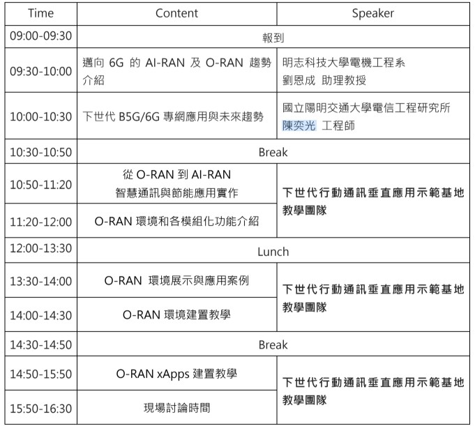 活動以前瞻且務實的角度介紹從O-RAN到AI-RAN的整體架構到各模組與介面關聯,說明AI-RAN及O-RAN Alliance工作組的職責與協作關係,建立參與者對生態與實務導入的初步認知。透過安排實作入門,包含 O-RAN 基礎環境建置與xApp 安裝與操作,協助學研與產業夥伴快速形成可延伸之 PoC 起點。