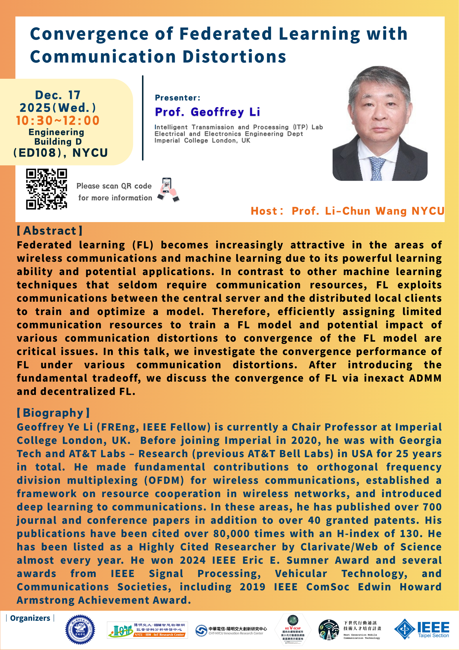 NYCU-IBM iIoT Research Center is going to invite Prof. Geoffrey Li to speech for us.